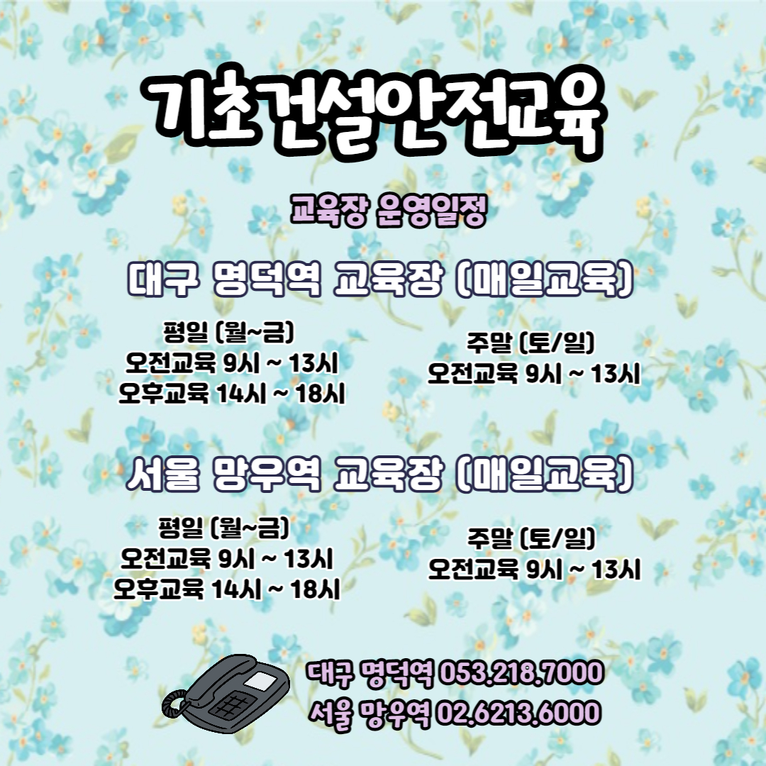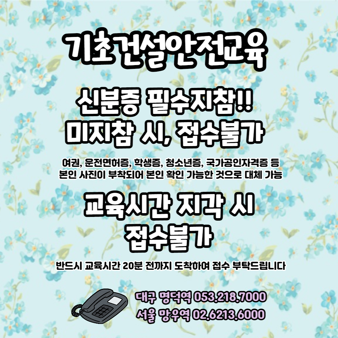 대구 명덕역 건설기초안전교육 오실때는 위 교육시간표를 참고해서 방문해주시면 됩니다. 이 교육은 평일과 주말과 공휴일 상관없이 매일매일 교육이 진행됩니다. 평일에는 오전9시와 오후2시 그리고 주말과 공휴일에는 오전9시에 교육이 진행됩니다. 평일에 직장이나 학교로 인해 교육장 방문하기 어려우셨던 분들은 주말에 편하실때 방문해주시면 되고, 대구/경북 거주자가 아니더라도 상관없이 교육 들으실 수 있고 이수증 발급도 당일에 가능하니 언제든지 방문해주시면 되셔요. 문의사항은 교육장으로 언제든지 전화주시면 됩니다.