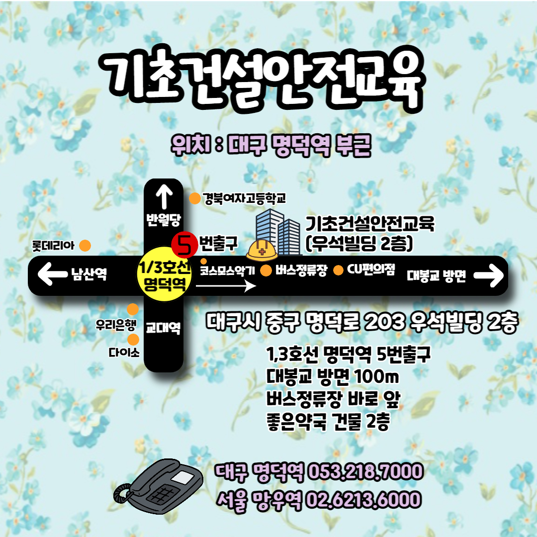 | 건설안전보건교육장 이수증 당일발급 무료교육지원 가능 053.218.7000 대구 명덕역 부근 위치 (0) | 2023.03.16 |